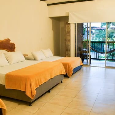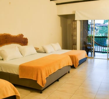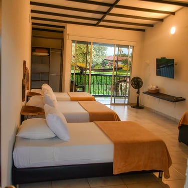 Disfruta de una acogedora habitación con balcón, baño privado, agua caliente, televisión por cable. y todas las comodidades necesarias para una estancia placentera en la naturaleza.